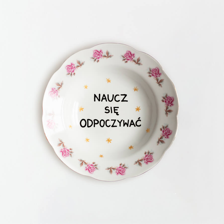 ❣ Przedmiot ma charakter wyłącznie dekoracyjny, nie powinno się na nim spożywać posiłków, nie należy myć go w zmywarce, ani używać w mikrofalówce. Można go czyścić delikatną stroną gąbki z niewielką ilością płynu do naczyń pod letnią wodą lub płynem do szyb używając ręcznika papierowego.